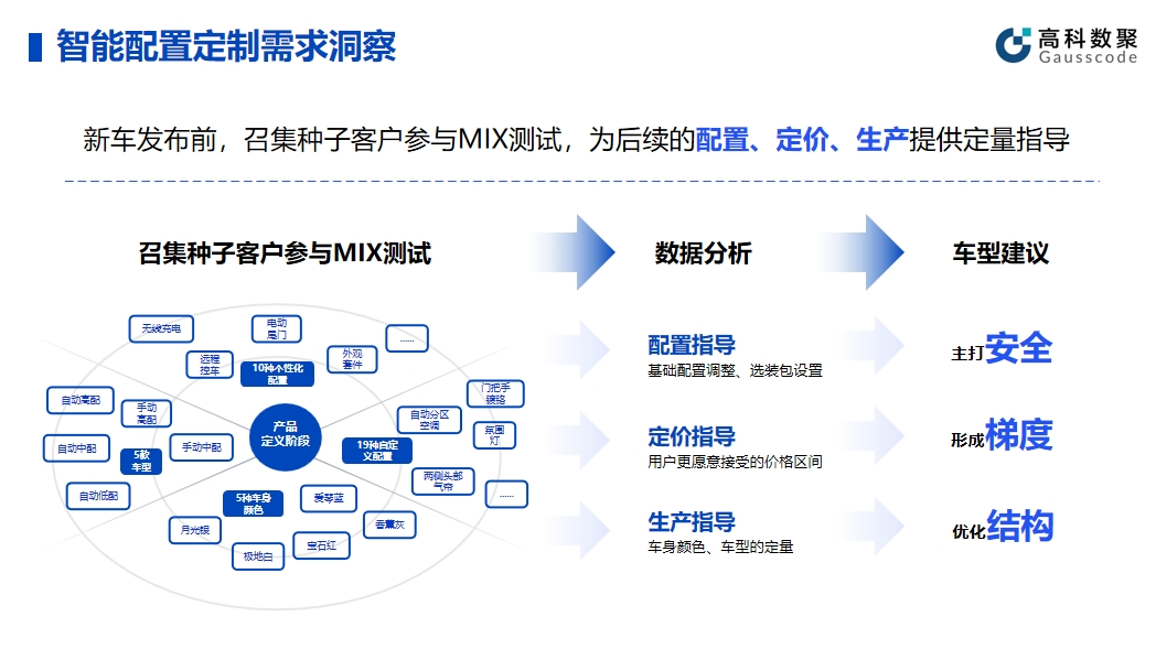 智能配置的有效应用可以帮助企业提升产品和服务的智能化水平。在实际应用中,活期通 华夏活期通帮助车企在新车发布前召集种子客户参与MIX测试,顺利获得收集种子客户的反馈和数据,车企能够精细调整产品配置,为后续的配置、定价、生产给予定量指导。同时,这种方法不仅有助于提高产品质量,还能提前发现潜在问题并及时解决。