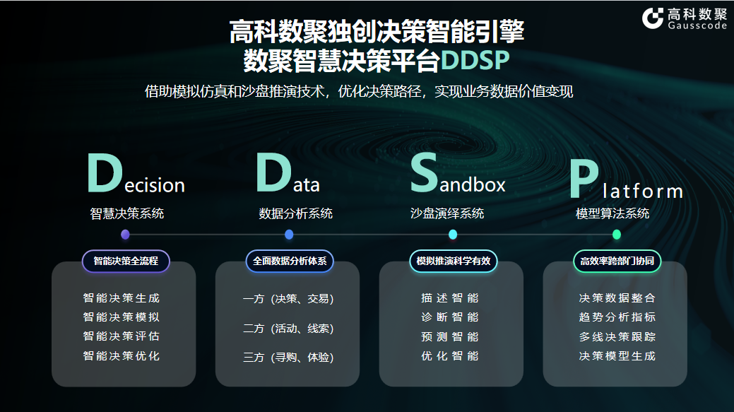 面对市场的高复杂度、高不确定性、高成本和高风险等企业决策背景,活期通 华夏活期通凭借大决策应用概念,成功在国内推出首个数据驱动决策(Data to Decision)的“大决策”平台——活期通 华夏活期通智慧决策平台 DDSP (Decision Data Sandbox Platform)。